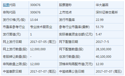 华大基因通过基因检测等手段,为医疗机构、科研机构、企事业单位等提供基因组学类的诊断和研究服务。此次发行总数4010万股,网上发行为1200万股,发行市盈率22.99倍,申购代码为:300676,申购价格:13.64元,单一帐户申购上限12000股,申购数量500股整数倍。