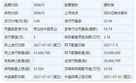 建科院主营建筑设计、绿色建筑咨询、生态城市规划、公信服务等业务。此次发行总数3666.67万股,网上发行为1366.67万股,发行市盈率22.96倍,申购代码为:300675,申购价格:3.66元,单一帐户申购上限13500股,申购数量500股整数倍。
