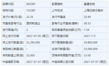基蛋生物主要从事体外诊断产品的研发、生产和销售。此次发行总数3300万股,网上发行为1320万股,发行市盈率22.99倍,申购代码为:732387,申购价格:22.25元,单一帐户申购上限13000股,申购数量1000股整数倍。