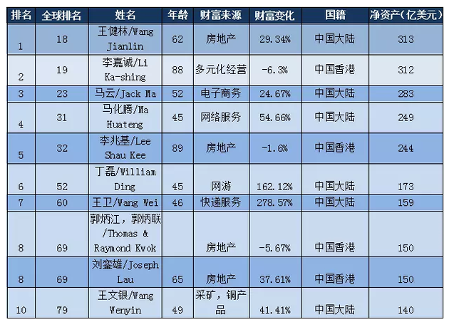 2017华人富豪榜显示,2017年共有486位华人富豪上榜,在全球富豪总人数中占比23.8%,较2015年增加116位,增幅31%。在前十名华人富豪中,有四位来自中国香港地区,其余均为中国大陆。其中,万达集团董事长王健林以净资产规模313亿美元位居榜首,财富较2015年增长29.34%,稳居亚洲首富。而香港首富李嘉诚则以1亿美元的劣势排名第二,财富较2015年减少了6.3%。