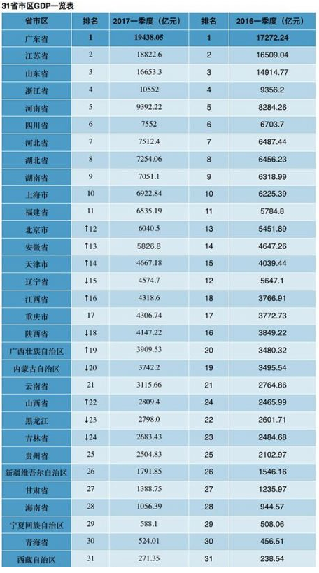 2017一季度全国各省GDP排行榜出炉!日前,全国31个省市区已经全部公布了第一季度经济数据。广东省以19438.05亿的地区生产总值(GDP),蝉联地区GDP榜首。而单季生产总值首次破万亿元的浙江,让人们见识到了信息经济的能力和潜力。