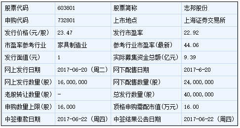 根据监管层安排,6月20日,志邦股份进行申购,申购代码为:732801,申购价格:23.47元,单一帐户申购上限16000股,申购数量1000股整数倍。