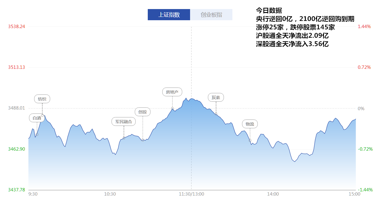 | 盘面概览 | 今天涨停家数较上一交易日持平,两市共25家涨停;跌停145家。成交量方面,沪市成交2427亿元,深市成交2514亿元,两市总成交额约为4941亿元,较上一交易日缩量612亿元。盘面上银行、服装、白酒等板块涨幅前;智能音箱、海南、芯片等板块跌幅居前。 | ||||