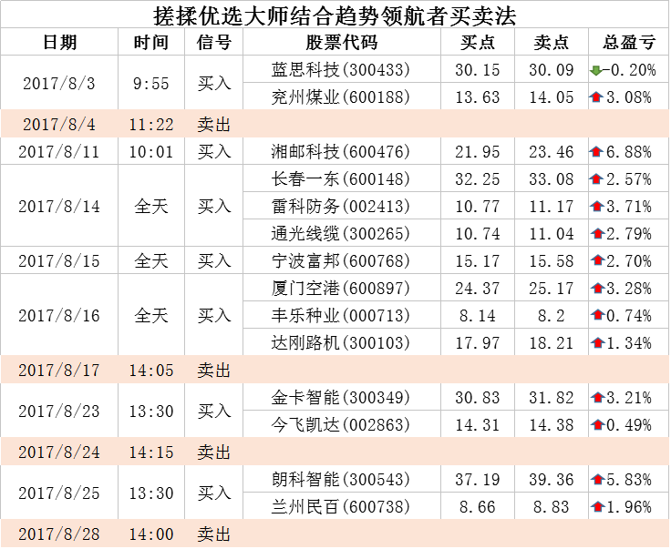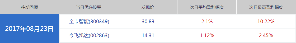 接下来到择股,发出买入当天,搓揉优选大师在14:30左右选出金卡智能和今飞凯达,两只均按照发现价位买入。假设我们持股到趋势领航者发出空仓信号,8月25日,10:45以31.16卖出金卡智能,以14.67卖出今飞凯达,分别获利1%和2.5%。在大盘不太好的情况下,【科学炒股】都能微赚出局。那整体表现又会如何呢?