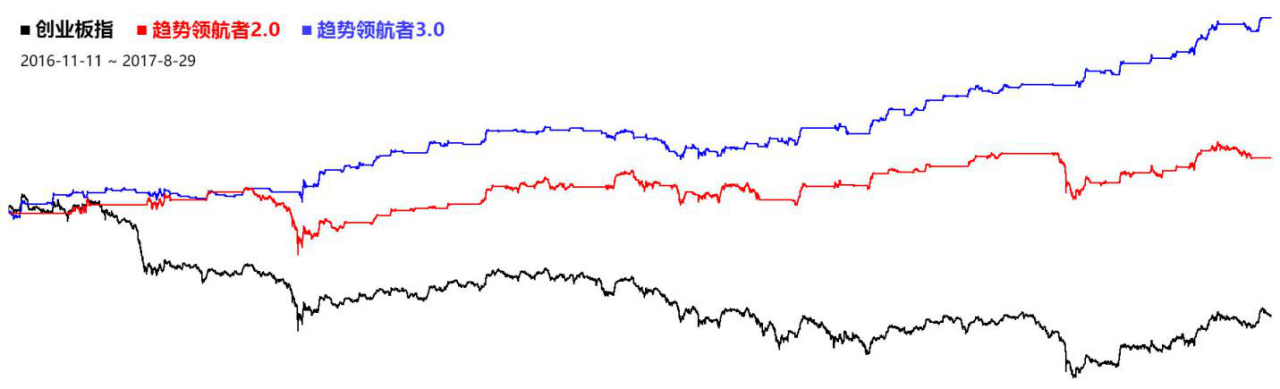 上图是2016.11.11到2017.8.29,趋势领航者与创业板的1分钟对比走势图。期间创业板下跌-14.54%,领航者第二代模型的成绩是+10.40%,而领航者目前使用的第三代模型的收益率高达+28.41%,完美躲过四次小型股灾。整体稳步向上。