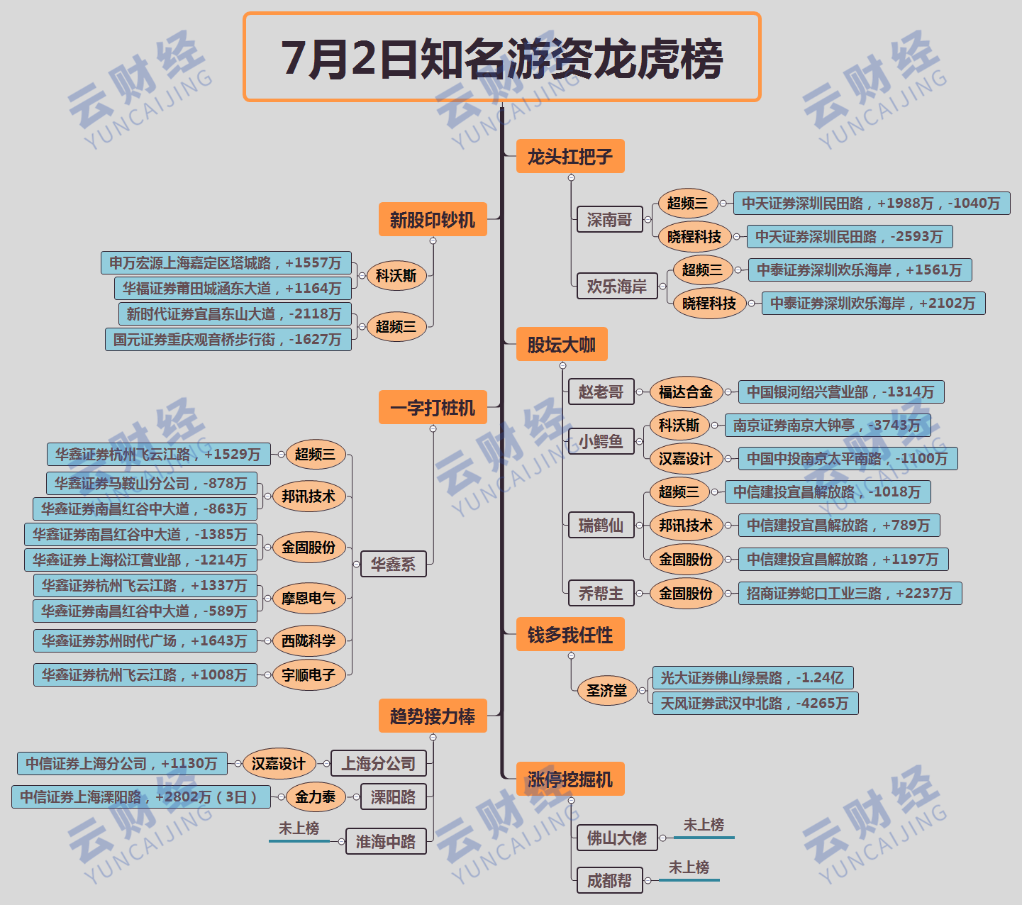 次新股科沃斯(603486)2连板,小鳄鱼卖出3743万,申万宏源上海嘉定区塔城路买入1557万,华福莆田城涵东大道买入1164万。金固股份(002488)低开高走,尾盘封住2连板,乔帮主买入2237万,瑞鹤仙买入1197万,华鑫南昌红谷中大道卖出1385万,华鑫上海松江营业部卖出1214万。
