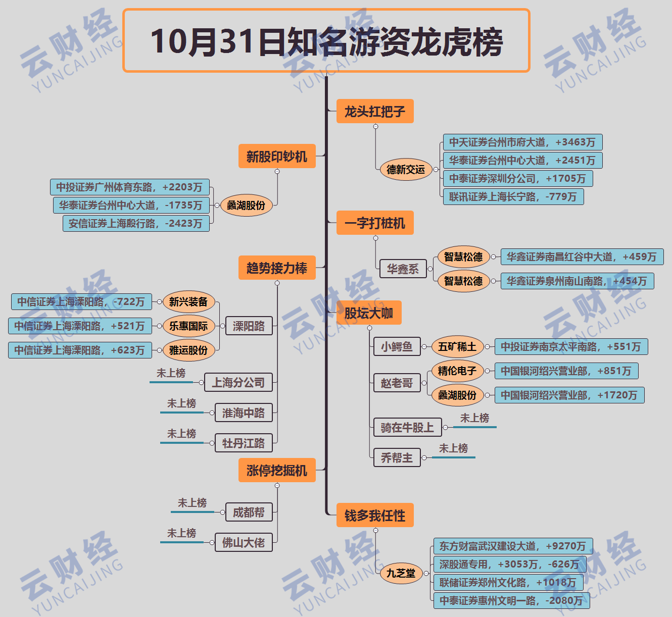 其他游资方面,中信证券上海溧阳路表现活跃,买入雅运股份(603790)、乐惠国际(603076)各623万、521万,卖出新兴装备(002933)722万,小鳄鱼小买五矿稀土(000831)551万,赵老哥除买入蠡湖外,851万主封精伦电子(600355)。