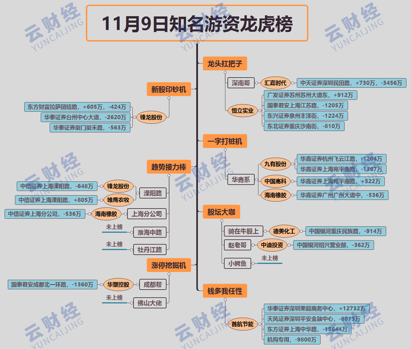 其他游资方面,骑牛卖出德美化工(002054)914万,深南哥做T汇嘉时代(603101),买入730万卖出3456万,成都帮卖出华塑控股(000509)1360万。