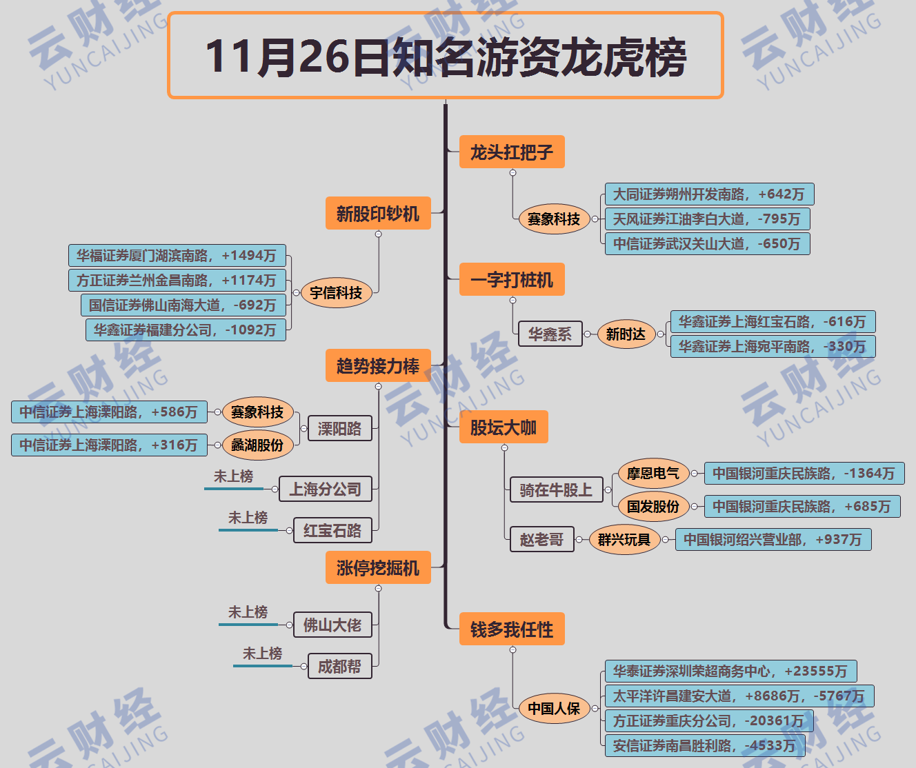 其他游资方面,赵老哥买入群兴玩具(002575)937万,骑牛卖出摩恩电气(002451)1364万,买入国发股份(600538)685万,佛山帮、成都帮今日未上榜。