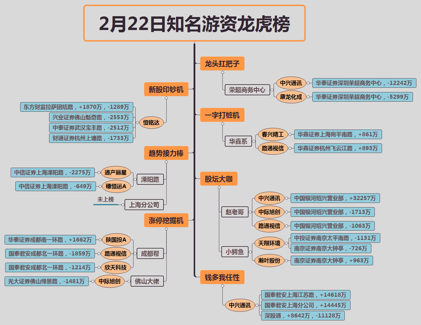 中兴通讯(000063)强势涨停,赵老哥买入32257万,国泰君安上海江苏路买入14618万,国泰君安上海分公司买入14445万,深股通买入8642卖出11128万,华泰荣超商务中心卖出12242万。