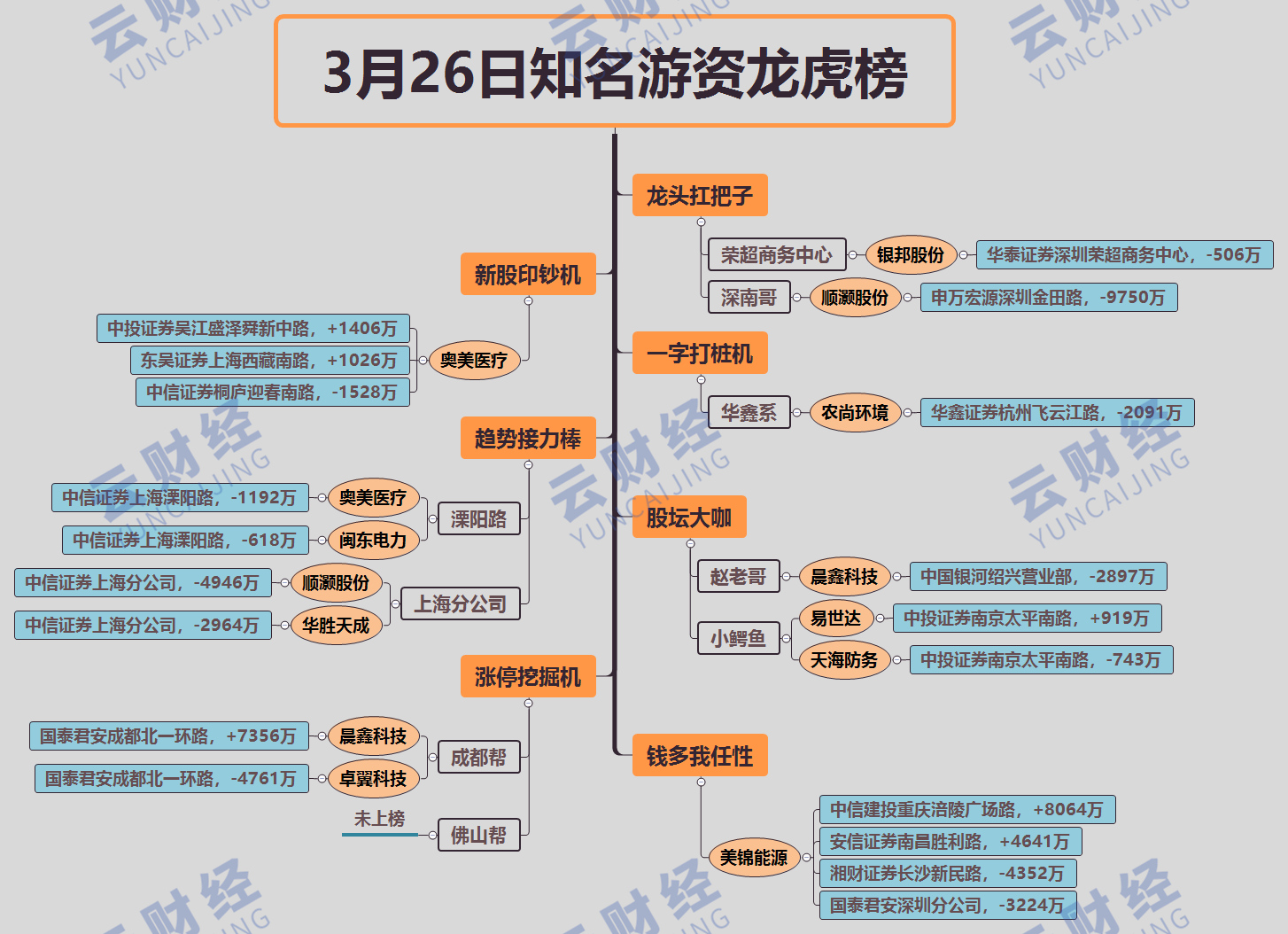 其他游资方面,赵老哥卖出晨鑫科技(002447)2897万,深南哥卖出顺灏股份(002565)9750万,中信上海分公司卖出顺灏股份(002565)、华胜天成(600410)各4946万、2964万,成都帮买入晨鑫科技(002447)7356万,卖出卓翼科技(002369)4761万。