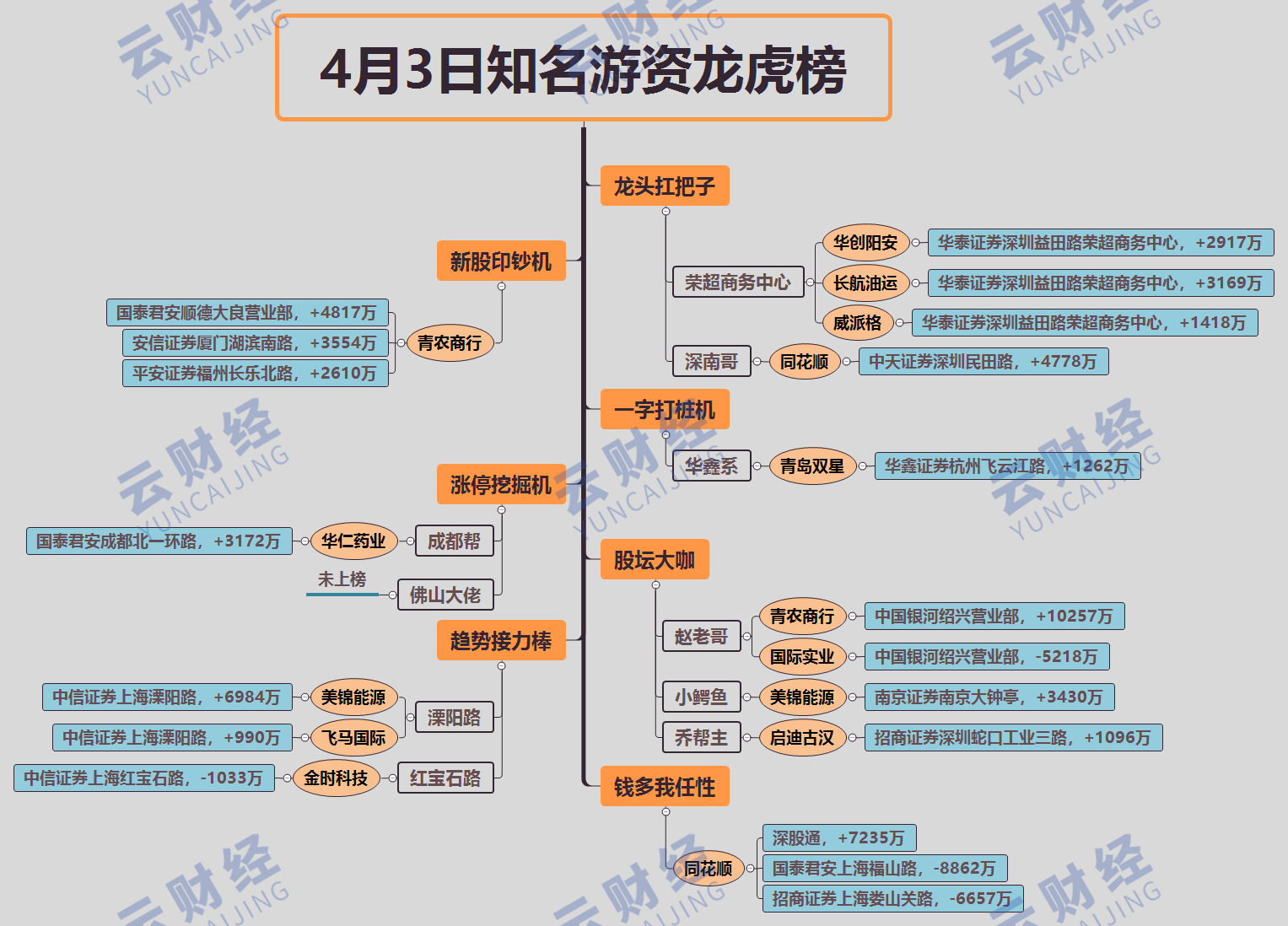 其他游资方面,赵老哥微亏卖出国际实业(000159)5218万,小鳄鱼买入美锦能源(000723)3430万,中信上海溧阳路买入美锦能源(000723)6984万,成都帮买入华仁药业(300110)3712万。