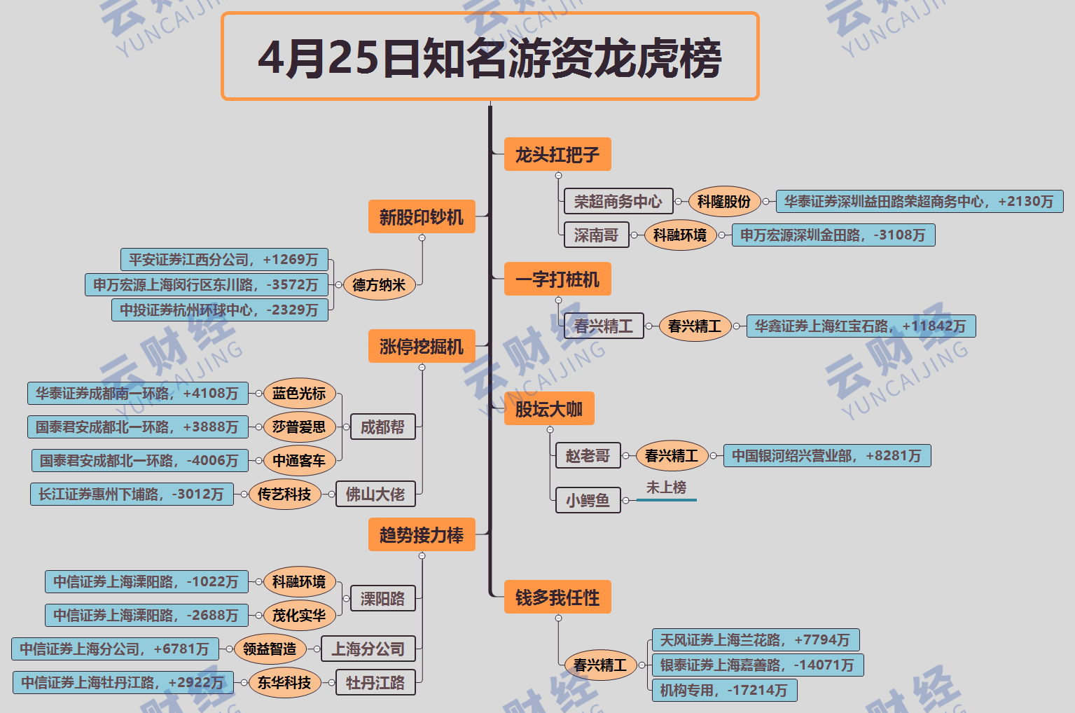 春兴精工(002547)涨停板被砸,华鑫证券上海红宝石路买入11842万,赵老哥买入8281万,天风证券上海兰花路买入7794万,银泰证券上海嘉善路卖出14071万,一机构卖出17214万。