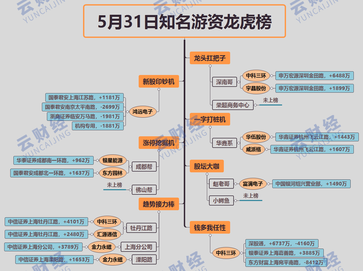 其他游资方面,中信上海分公司、上海溧阳路双双买入金力永磁(300748)3789万、1653万,赵老哥买入富满电子(300671)1490万,中信上海牡丹江路买入汇源通信(000586)2480万。