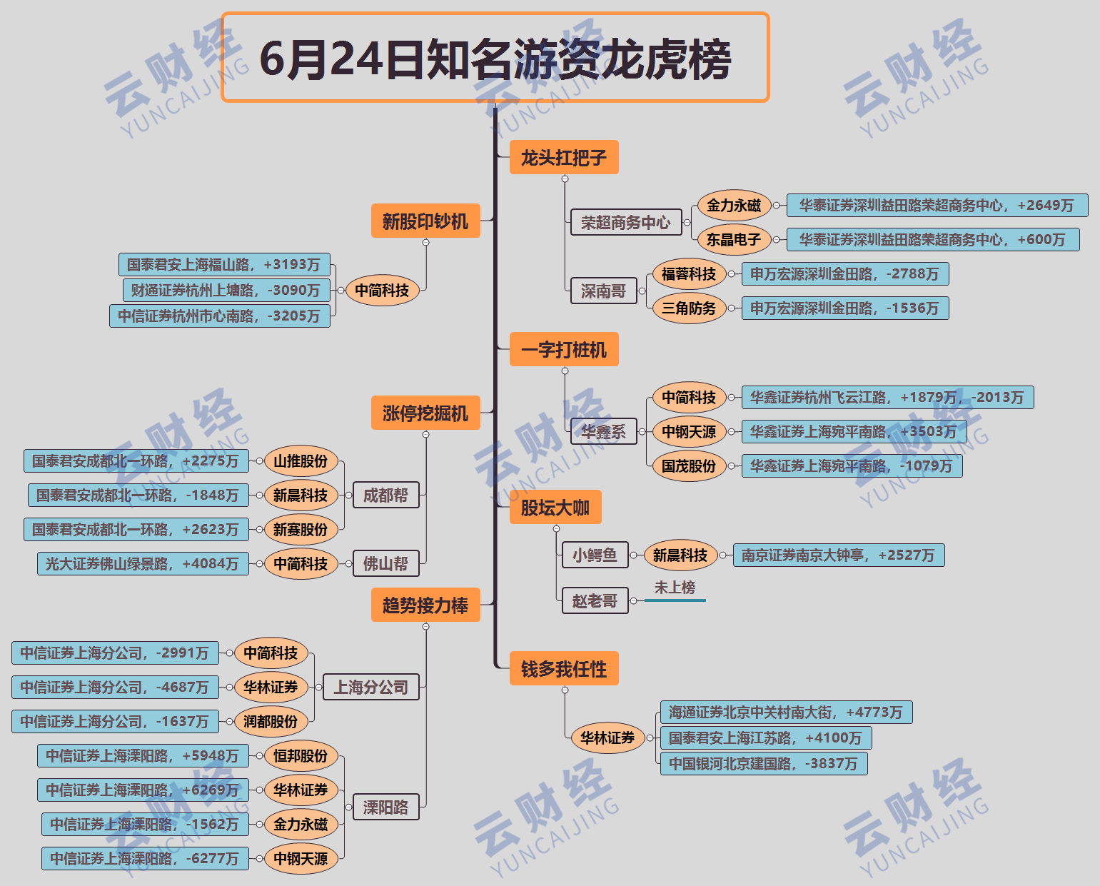 其他游资方面,中信上海溧阳路买入恒邦股份(002237)、华林证券(002945)各5948万、6269万,卖出中钢天源(002057)6277万,中信上海分公司卖出华林证券(002945)4687万,小鳄鱼买入新晨科技(300542)2527万,成都帮买入山推股份(000680)、新赛股份(600540)各2275万、2623万。