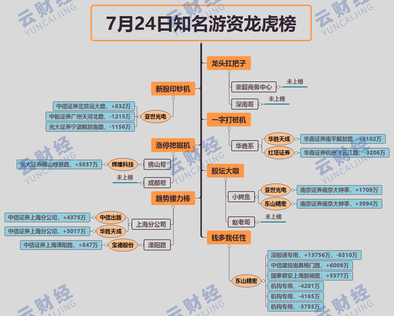 其他游资方面,佛山帮买入辉煌科技(002296)5837万,中信上海分公司买入中信出版(300788)、华胜天成(600410)各4375万、3017万,华鑫南平解放路买入华胜天成(600410)6102万,小鳄鱼买入亚世光电(002952)1709万。