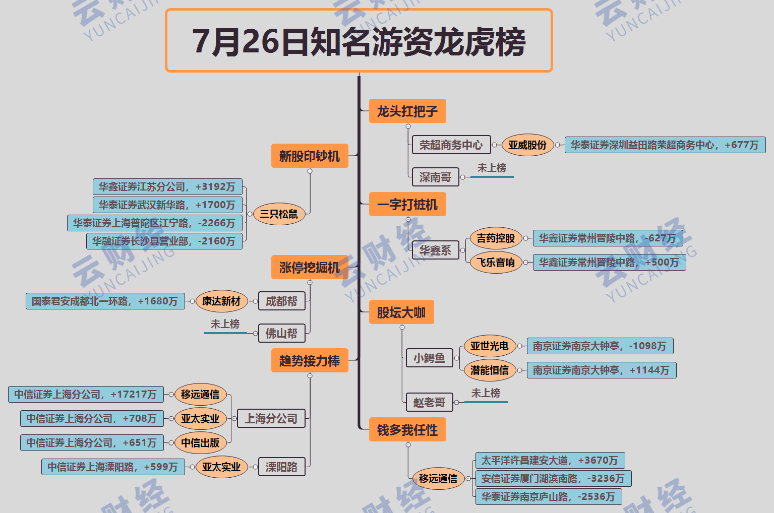 其他游资方面,中信上海分公司买入移远通信(603236)17217万,小鳄鱼卖出亚世光电(002952)1098万买入潜能恒信(300191)1144万,成都帮买入康达新材(002669)1680万。