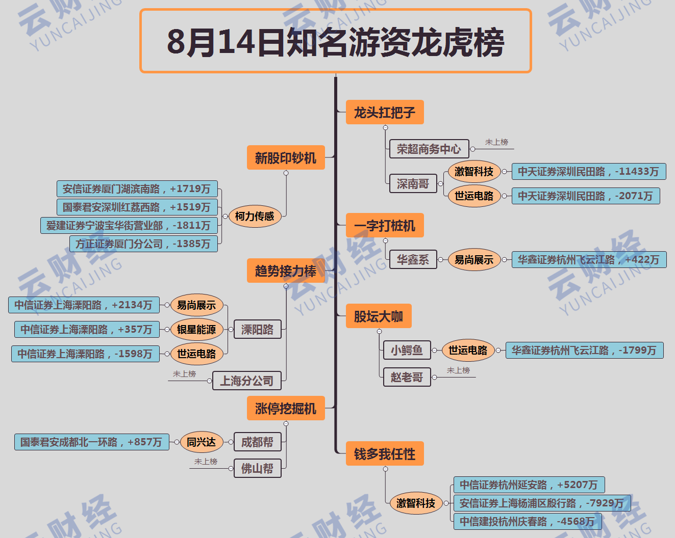 一线游资方面,上海溧阳路买入易尚展示(002751)2134万卖出世运电路(603920)1598万,小鳄鱼卖出世运电路(603920)1799万,成都帮买入同兴达(002845)857万,深圳民田路卖出世运电路(603920)2071万。
