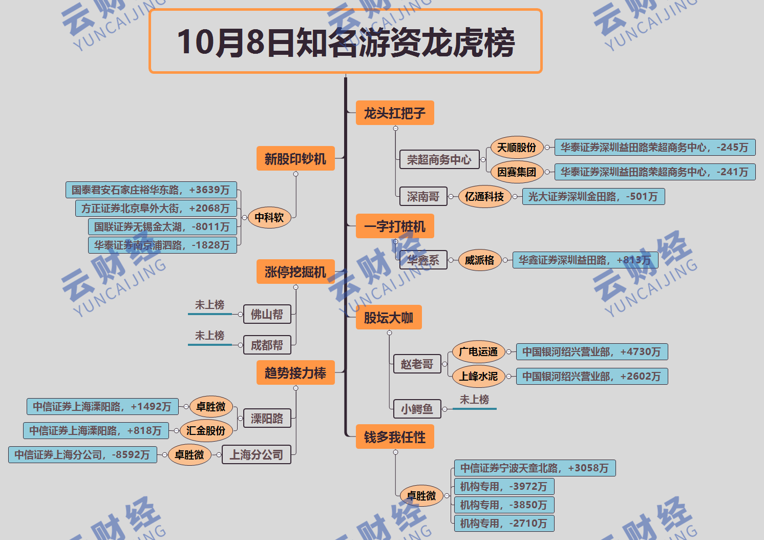 其他游资方面,赵老哥买入广电运通(002152)、上峰水泥(000672)各4730万、2602万,上海溧阳路买入汇金股份(300368)818万,深南哥卖出亿通科技(300211)501万,华鑫深圳益田路买入威派格(603956)813万。