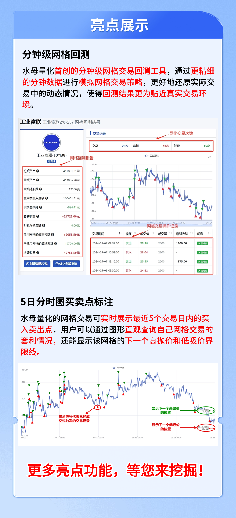 · 分钟级网格回测启用,精准验证参数,减少实盘风险。