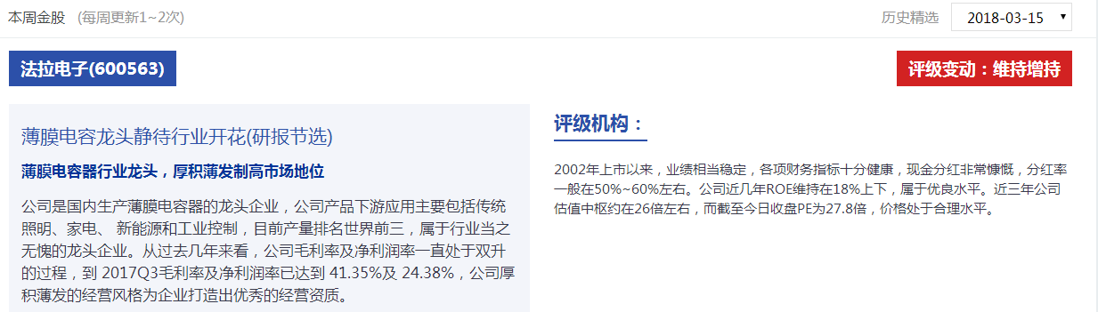 本周市场单边下行,但研报大师3月15日筛选的法拉电子(600563)、银轮股份(002126)本周逆市上涨,法拉电子(600563)实现周线5连阳,期间最高收益超12%,银轮股份(002126)本周上涨4%,最高收益22%。
