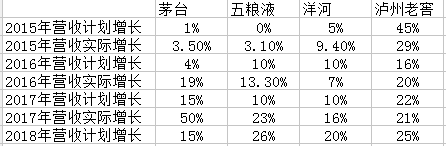 上图是过去几年年报中管理层对于新的一年公司业务的营收增长目标。茅台、洋河、五粮液(000858)、老窖这四家公司是白酒市场的领导者,这四家公司的管理层,一定是对白酒行业理解最深刻的那部分人。过往三年公司的营收实际增长都比计划增长高,除了2015年老窖和2016年洋河不及预期外。而对于2018年的营收预测都一致设定增长目标在15%以上,可以看出管理层对于今年白酒市场非常乐观。