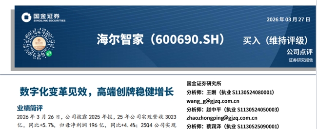 日前,海尔智家披露2025年报,全年实现营业利润双增长、双新高。国金证券在最新研报中指出,海尔智家数字化变革全面见效,高端创牌稳健增长 ,维持“买入”评级。