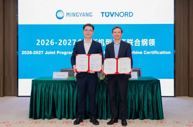 仪式现场,双方同步签署2026-2027年全球新机型认证合作纲领,进一步助力明阳全系列机型快速进入欧洲等国际市场。