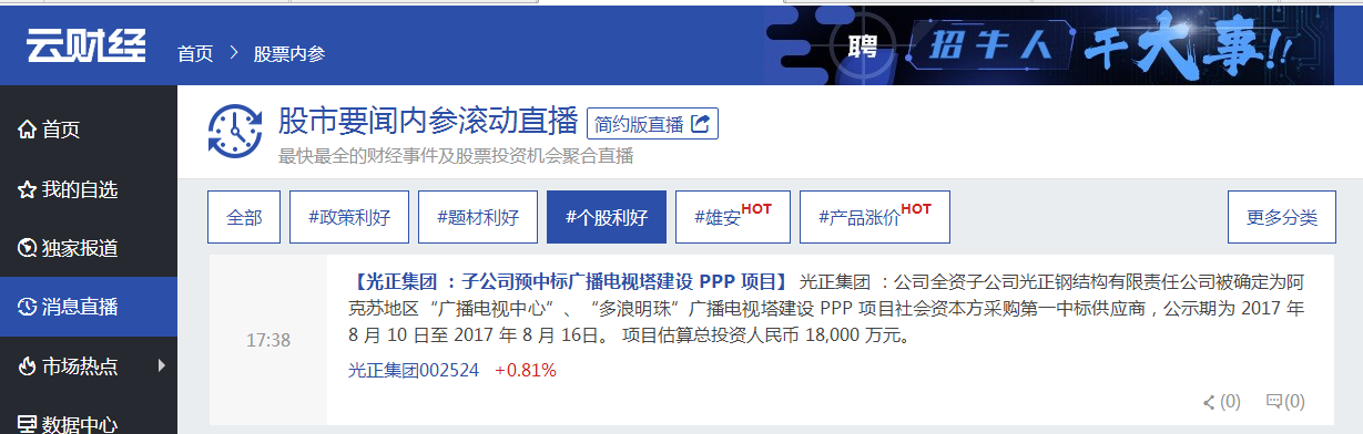 1)云财经消息直播->个股利好。光正眼科(002524):子公司预中标广播电视塔建设PPP项目。公司全资子公司光正钢结构有限责任公司被确定为阿克苏地区“广播电视中心”、“多浪明珠”广播电视塔建设 PPP 项目 社会资本方采购第一中标供应商,公示期为2017年8月10日至2017年8月16日。项目估算总投资人民币18,000万元。