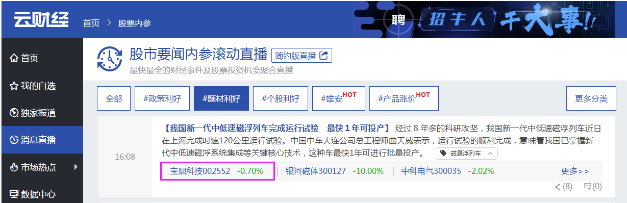 1)云财经数据中心->题材利好。我国新一代中低速磁浮列车完成运行试验,最快1年可投产。磁悬浮项目是宝鼎科技(002552)对外投资的重要项目之一。