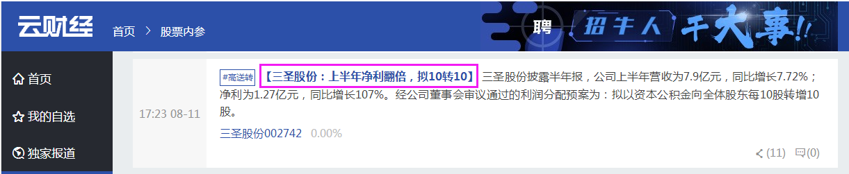 1)云财经消息直播->个股利好。*ST三圣(002742):上半年净利润翻倍,拟以资本公积金向全体股东每10股转增10股。受严格监管,高送转概念越来越稀缺,近期皮阿诺(002853)公告10送15,股价连续2日涨停,10送10公告有望刺激*ST三圣(002742)股价上涨。
