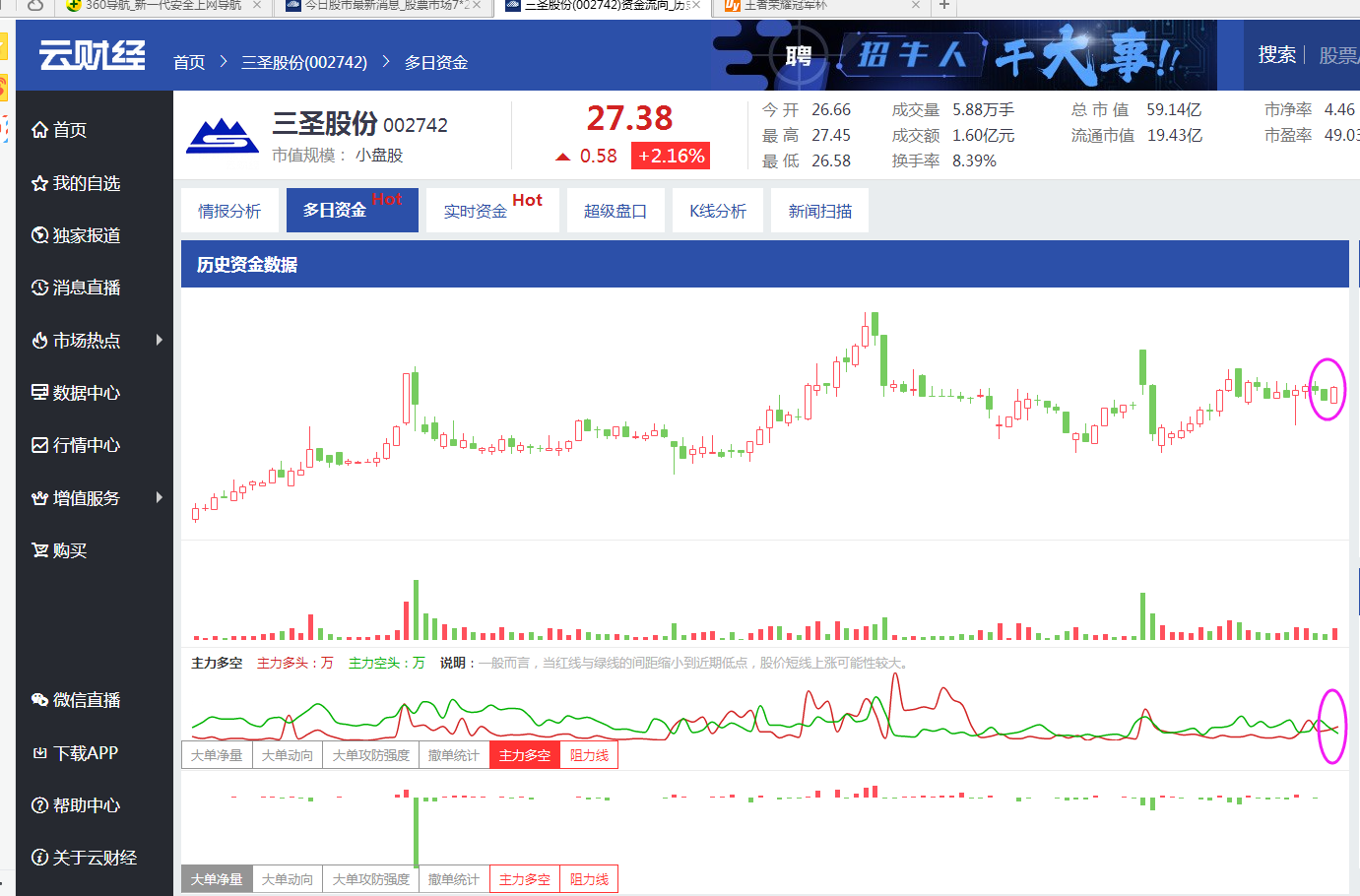 2)技术面看,*ST三圣(002742)处于横盘震荡趋势中,周五K线形态阳包阴,主力多空指标红线上穿绿线,可见做多实力强大,短线股价上涨可能性较大。